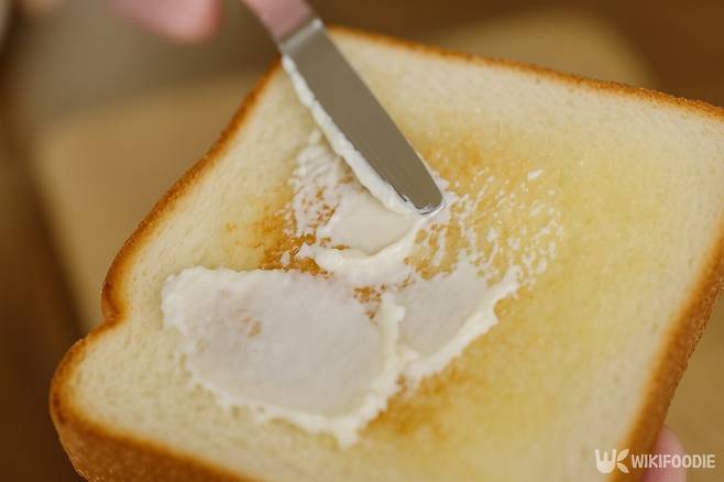 2. 구운 식빵 위에 크림치즈 1큰술을 고르게 바른다