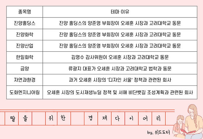 오세훈 관련주는 그의 정책 방향, 과거 경력, 또는 개인적 인연을 바탕으로 형성된 정치 테마주예요. 주요 종목으로는 진양홀딩스, 진양화학, 진양산업, 한일화학, 금양, 자연과환경, 도화엔지니어링 등이 있어요.