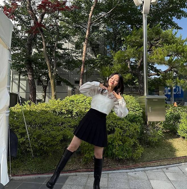 가수 흰이 계단에서 포즈를 취한 사진이 시선을 사로잡는다. 흰은 화이트 셔츠와 블랙 플리츠 미니스커트, 그리고 블랙 롱부츠로 절제된 컬러감 속에서도 시크한 존재감을 발산했다. 깔끔한 무채색 조합은 단정하면서도 세련된 분위기를 풍기며, 미니멀 무드 속 Y2K 감성을 자연스럽게 녹여냈다.
