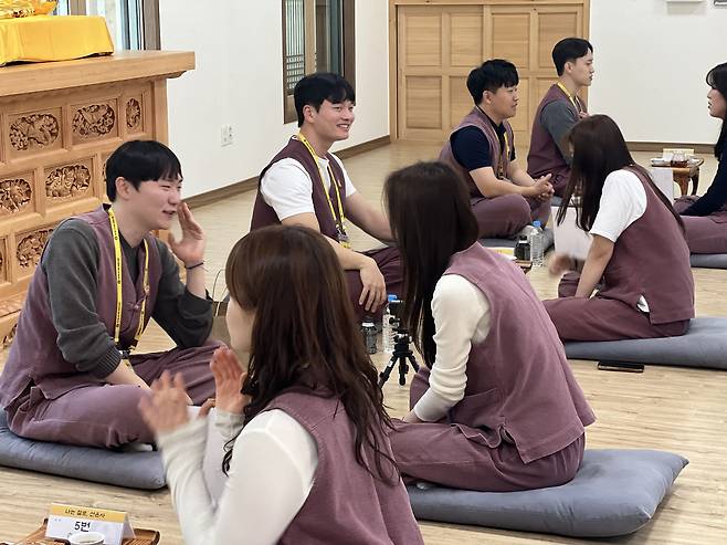 제비뽑기로 짝을 이룬 남녀 참가자들은 선운사 경내를 함께 산책하고 공양실에서 점심 식사를 하며 거리감을 좁혔다. 법복으로 갈아입은 뒤 진행된 입재식에서는 참가자들의 매력 발산 시간이 이어졌다. 어린이집 교사 유동백씨는 율동을 선보였고, 김장어씨는 시 ‘선운사에서’를 낭송해 눈길을 끌었다. 중국어과 출신 김동백씨는 사찰 분위기에 걸맞은 중국시를 읊으며 분위기를 고조시켰다. 송동백씨는 재치 있는 4행시로 설레는 마음을 전했다.