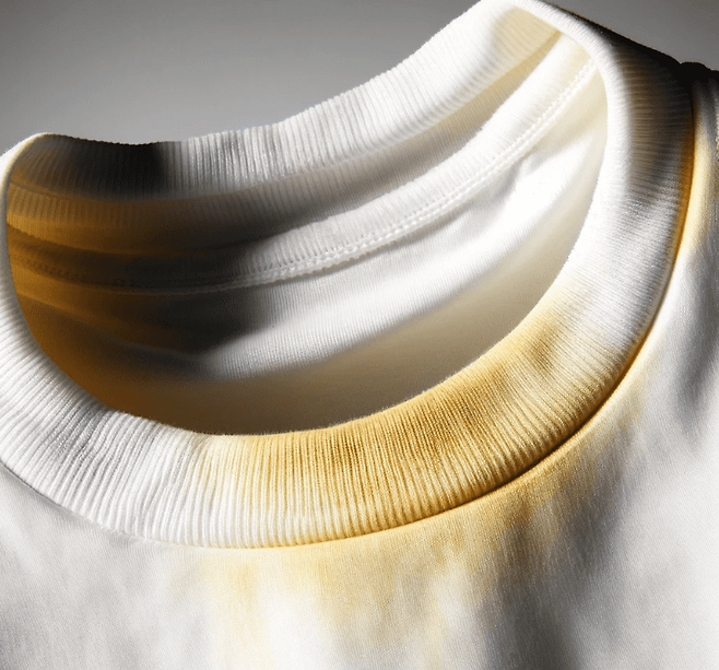 겨울 동안 옷장에 들어있던 티셔츠를 오랜만에 꺼냈더니 누렇게 변하는 이유는, 주로 사람의 땀과 피부의 기름 때문입니다. 세탁 과정에서 완전히 제거 되지 않고 티셔츠에 남아 있던 노폐물은 시간이 흐를 수록 산화되어 누런 변색을 일으킬 수 있습니다.