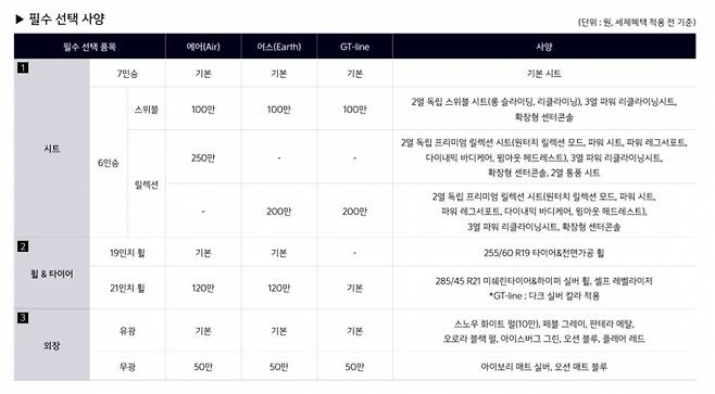 구동방식별로는 2WD 7671~8181만원, 4WD 8041~8551만원 등이다. 배터리는 99.8kWh 단일로 운영된다. 여기에 시트ㆍ휠&타이어ㆍ외장컬러 등 필수옵션을 추가하면 된다.