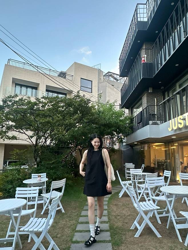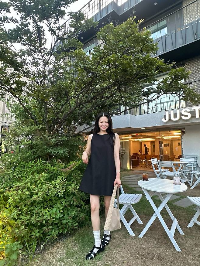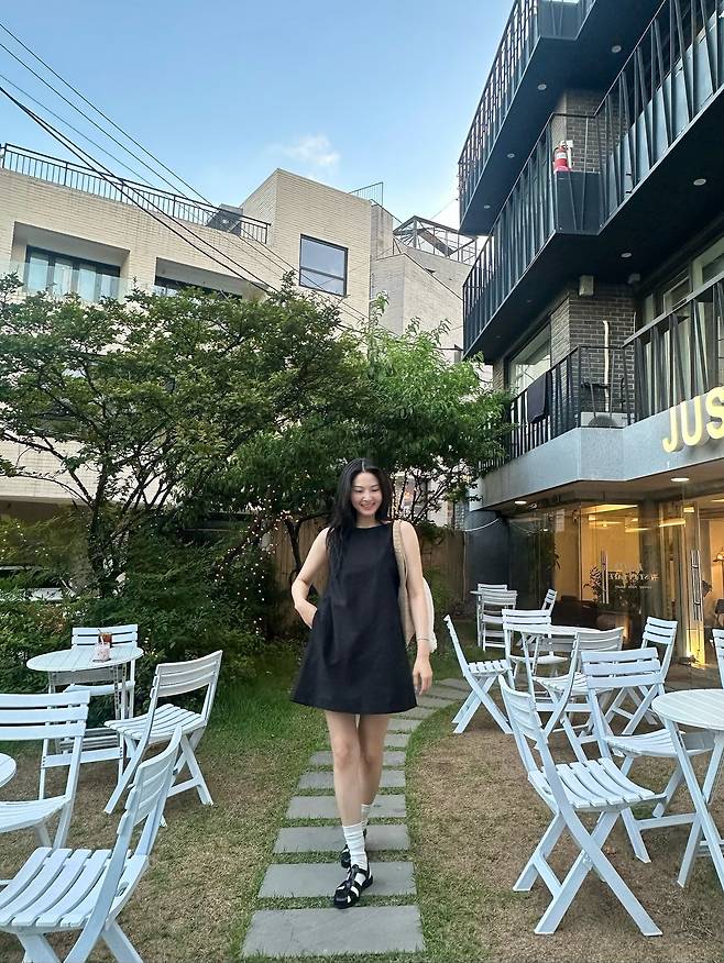 화이트 체어와 그린 가든이 어우러진 조용한 테라스에서, 류이서는 블랙 슬리브리스 미니드레스로 시선을 사로잡았어요.