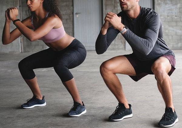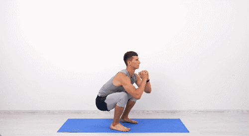 어깨너비보다 넓게 다리를 벌리고 서서 발끝은 약간 바깥쪽을 향하게 합니다. 엉덩이를 최대한 바닥 방향으로 낮추며 스쿼트 동작을 합니다. 올라올 때 발꿈치를 들어 종아리에 힘을 주며 일어섭니다.