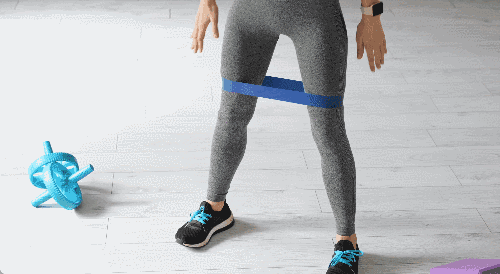바닥에 서서 허벅지 중간에 밴드를 착용합니다. 두 다리는 어깨너비보다 넓게 벌려 밴드를 팽팽하게 만듭니다. 자세를 낮추며 스쿼트 동작을 수행하고, 동시에 양손을 가슴 앞으로 모아줍니다. 다시 올라오면서 양손은 자연스럽게 내려줍니다.