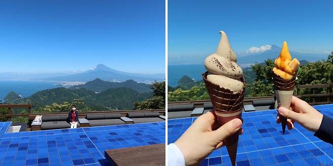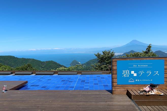 산 정상에는 '아오테라스'라는 곳이 있어요. 이곳에선 후지산과 스루가만, 이즈 지역이 눈앞에서 파노라마로 펼쳐져요!(사진 대박이죠...)🗻 '아오테라스'의 명물은 파란색 타일에 물을 채워놓은 작은 연못이에요. 연못에 비친 후지산 모습과 함께 인생샷을 찍을 수 있기 때문이죠.📸 '아오'는 일본어로 파란색이란 뜻인데요.🟦 파란색 타일의 연못에서부터 파란 스루가만, 후지산, 그리고 파란 하늘까지 이어지는 파란색 파노라마 뷰는 말로 표현할 수 없을 정도로 아름다우니 후지산 뷰를 만끽하고 싶다면 '아오테라스'에 꼭 방문해 보세요!🫢 참, 테라스에서 맛볼 수 있는 아이스크림과 커피도 꼭 먹어보세요!