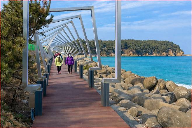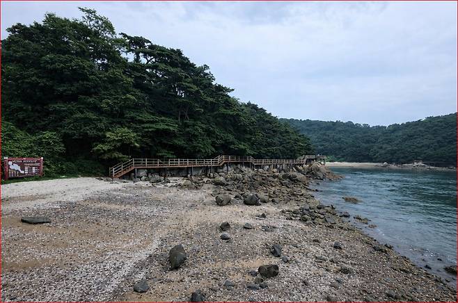 선착장 → 오형제바위 → 부아산 정상 → 구름다리 → 삼신할매약수터 → 해양생태관 → 작은풀안 해수욕장 → 해안산책로 → 선착장
