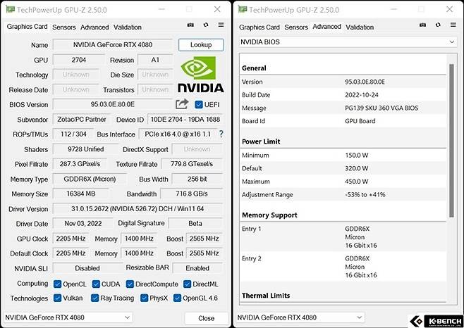 맥시멈 TDP 역시 높은 설정을 확인할 수 있는데, FE 모델은 맥시멈 TDP가 320W로 알려져있지만, ZOTAC GAMING 지포스 RTX 4080 AMP Extreme AIRO는 최대 450W로 BIOS상 확인 되는 모습이다.