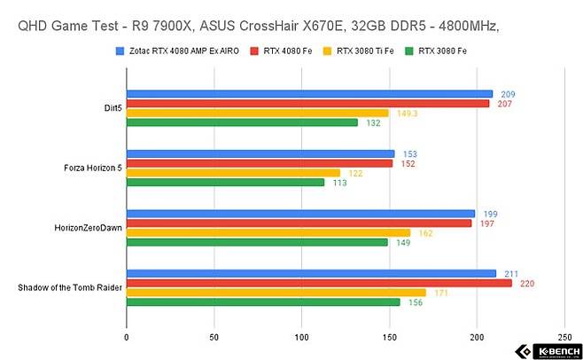 몇가지 게임으로 성능도 확인 해본 결과, 세대별 80 시리즈 끼리는 QHD나 4K에서 모두 40프레임 이상의 차이를 보여주는 모습도 확인할 수 있어 기본 체급, 거기에 오버클럭 차이까지 더해져 확실히 다른 급의 결과를 제공받을 수 있는 모습이였다.
