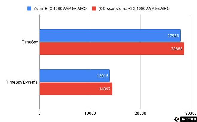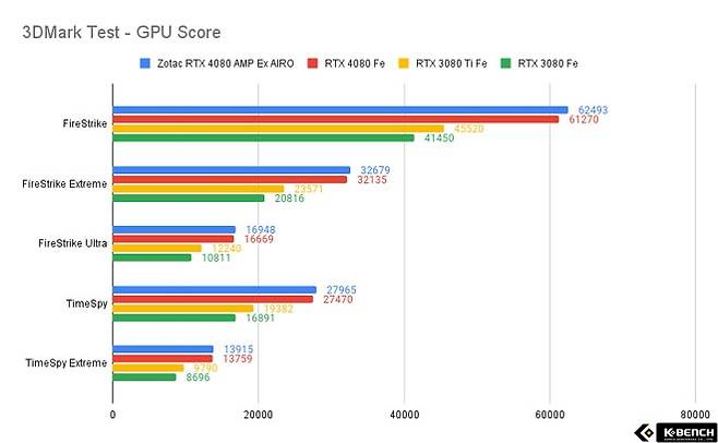 넘버링으로는 같은 RTX 3080 대비 이번 ZOTAC GAMING 지포스 RTX 4080 AMP Extreme AIRO은 거의 30%가 넘는 파이어스트라이크 GPU 스코어 차이를 보여주었고, RTX 3080 Ti 대비해서도 25~7% 차이를 보여줘 체급적으로 확실히 다른 레벨임을 보여줬다.