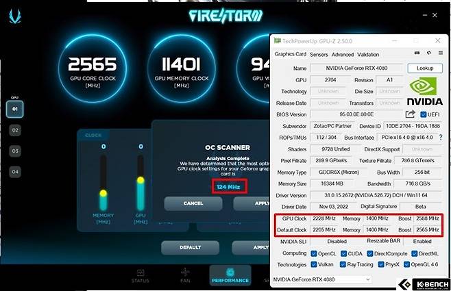 OC 스캐너상으로는 약 124MHz가 상승했다고 결과가 나왔지만, GPU-Z 상에서는 기본클럭과 부스트 클럭 모두 23MHz가 상승한 것으로 확인됐다.