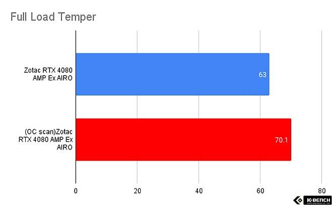 다만, 클럭과 전압을 더 사용하게 되는 만큼, 온도 측면에서는 풀로드시 63도 수준에서 70도로 올라간 모습을 볼 수 있었다.