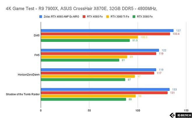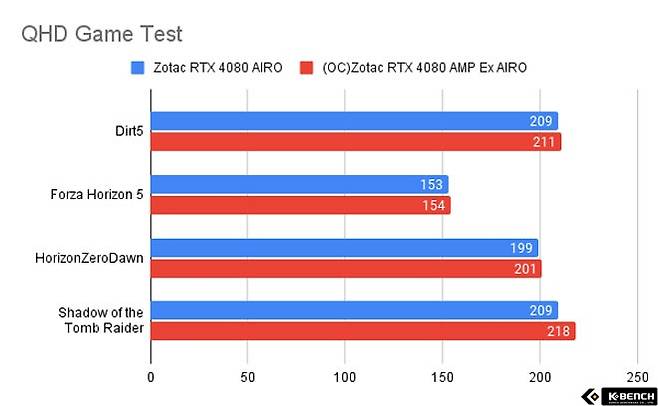 RTX 4080 FE 모델 대비해서도 팩토리 오버클럭된 ZOTAC GAMING 지포스 RTX 4080 AMP Extreme AIRO이기 때문에 좀 더 높은 성능을 발휘하는 것도 확인할 수 있었다.