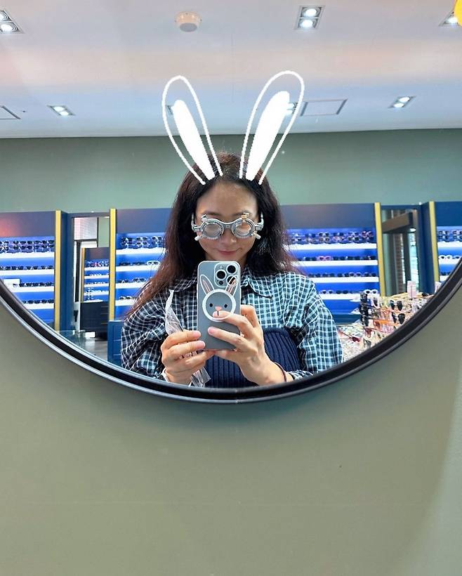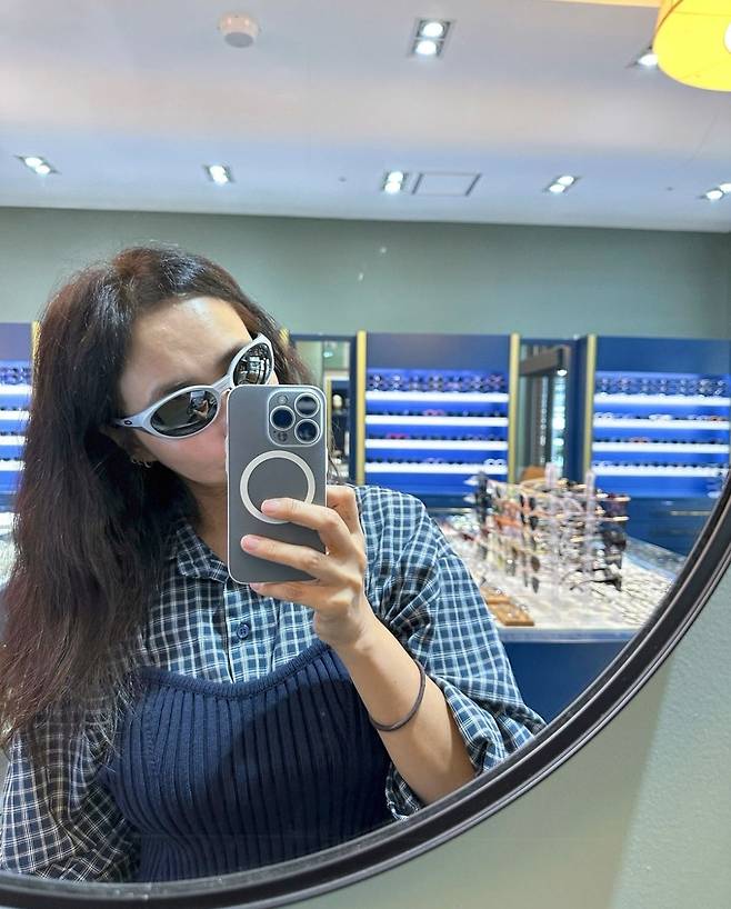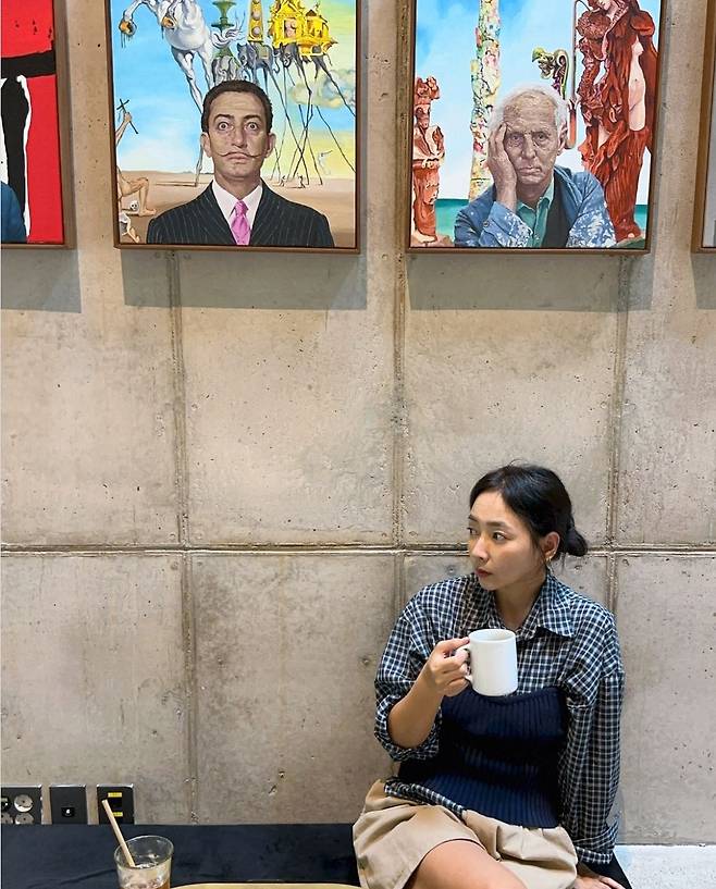 진재영은 체크무늬 셔츠에 니트 뷔스티에를 레이어드한 독특한 스타일링으로 시선을 사로잡았습니다.