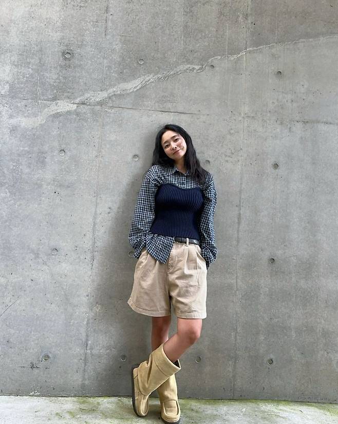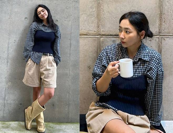 여기에 진재영은 베이지 컬러의 숏팬츠를 함께 매치해 편안하면서도 세련된 가을 룩을 완성했습니다.