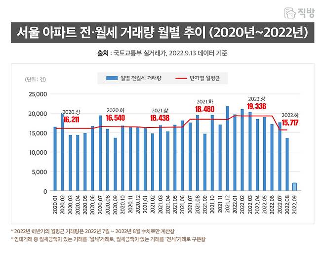 2022년 상반기에 서울 아파트 전·월세 거래가 총 11만 6,014건이 이뤄지며 전·월세 실거래가격을 발표한 2011년 이후 최고 거래량을 기록했다. 특히 월세거래는 2017년 하반기 이후 꾸준히 증가세를 보이며 2021년 하반기부터 4만 건 이상의 거래량을 보였다. 다만 2022년 하반기 들어서는 거래량이 다소 주춤한 가운데 직방은 2022년 서울 아파트 전·월세 가격대별 거래량을 살펴봤다.