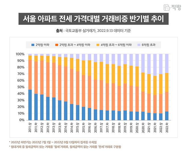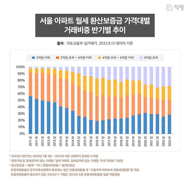 한편, 서울지역 월세 환산보증금의 가격대별 거래비중은 2022년 상반기에 6억원 초과 29.3%, 2억원 초과~4억원 이하 25.4%, 2억원 이하 25.3%, 4억원 초과~6억원 이하 19.9% 순이었다. 전세 거래처럼 2021년 하반기에 비해 6억원 초과 거래비중이 감소(31.0%→29.3%)하고 2억원 초과~6억원 이하 거래비중이 늘어났다(39.4%→ 45.3%). 2022년 하반기에는 2억원 이하 거래가 28.5%로 가장 많은 비중을 차지했으며 6억원 초과 거래는 28.7%로 소폭 줄었다. 월세 거래에서도 고가 임대차거래는 줄어들고 있다.
