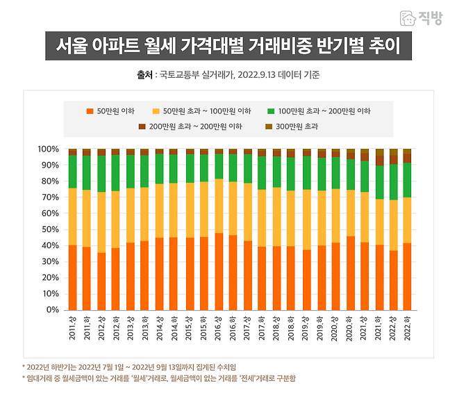 서울 월세 가격대별 거래량 비중은 2022년 상반기에 50만원 이하 37.4%, 50만원 초과~100만원 이하 거래가 30.9%, 100만원 초과~200만원 이하 거래가 21.7%, 200만원 초과~300만원 이하 거래가 5.8%, 300만원 초과 거래가 4.2% 순이었다. 2022년 하반기에는 50만원 이하 거래가 42.1%로 크게 늘고 다른 가격대는 조금씩 줄어들었다. 100만원 이하 월세 거래가 2021년 하반기와 2022년 상반기에는 70% 밑으로 줄었으나 2022년 하반기에는 다시 70%를 넘어섰다. 전세 세입자 중 전세보증금 상승분을 월세로 전환하여 거래하는 사례도 포함되어 월세 가격대는 다소 하향 조정된 것으로 보인다.