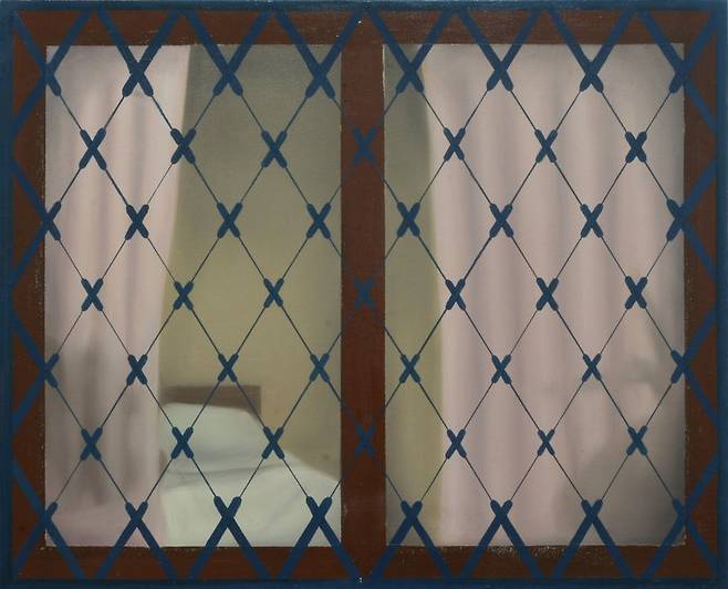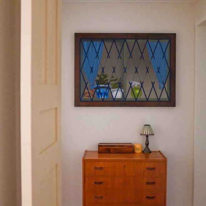 임진실 작가님의 <버드실 30-2> 작품입니다. 임진실 작가님은 주로 창문을 통해 보이는 이미지를 유화로 표현하시는데요, 사진 속 작품의 다이아몬드형 창살은 어느 구옥의 창문을 떠올리게 해, 아래 자칫 낡아 보이는 서랍장과도 잘 어울려 빈티지하면서도 세련된 느낌을 줍니다. 데드스페이스(dead space)였던 복도의 밋밋한 벽에 그림 한 장으로 개방감과 확장 효과까지 주었어요.