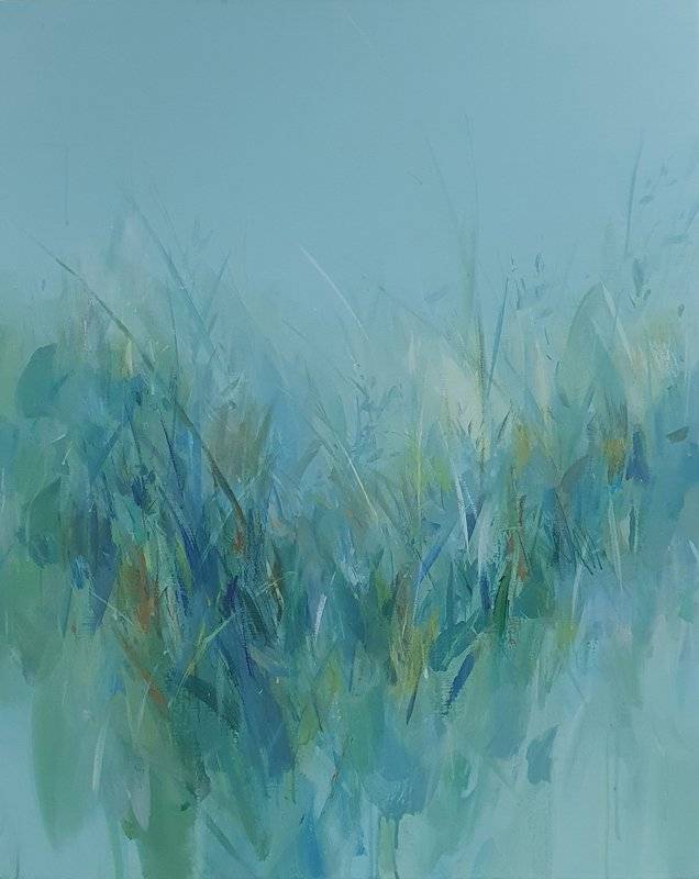 하늘색 단색 배경 위에 청량한 색감들이 시원시원한 붓질로 표현되었습니다. 이혜인 작가님은 주로 일상 속에서 볼 수 있는 작은 꽃, 화초들을 소재를 반추상적으로 표현하십니다. 다양한 푸른 색감과 여름 바람이라는 뜻의 <Summer Breeze>라는 작품명처럼, 다가오는 여름엔 그림 하나로 시원해지는 느낌을 경험해보세요.