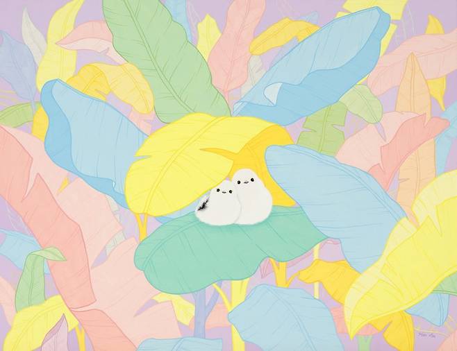 파스텔톤 색감의 이파리 위에 두 마리 작은 새가 앉아 있습니다. 이처럼 귀여운 소재와 파스텔 색감은 아이들 취향에 딱이죠. 알록달록한 아이들 가구와 매치했을 때도 잘 어울립니다. 혼자 자기 무서워하는 아이들에게도 귀여운 그림을 벽에 걸어 무서움을 덜어주는데 효과적이랍니다.