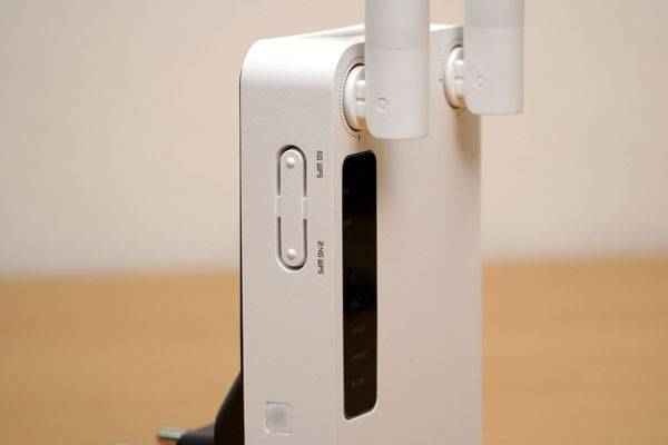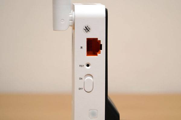 유선 랜 포트 아래로는 사용하지 않을 때 전원을 꺼둘 수 있도록 전원 ON/OFF 스위치와 장치를 다시 시작하거나 저장된 연결 설정을 초기화 할 수 있는 리셋(RST) 버튼이 달려있다. 리셋 버튼은 실수로 누르지 않게 뾰족한 물체로 찔러서 사용하도록 만들었다.