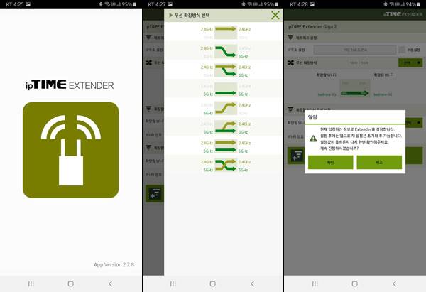 애플 앱스토어나 구글 플레이 스토어에서 앱을 다운받아 설치한 뒤 실행하면 주변의 ipTIME Extender 기기를 자동으로 검색하여 사용자가 원하는 무선 확장 방식을 선택하는 것이 가능하다. 5GHz 또는 2.4GHz 주파수 중에 하나만 확장하거나 2개를 동시에 확장, 그리고 5GHz와 2.4GHz를 크로스 시키는 방식의 확장도 지원한다.