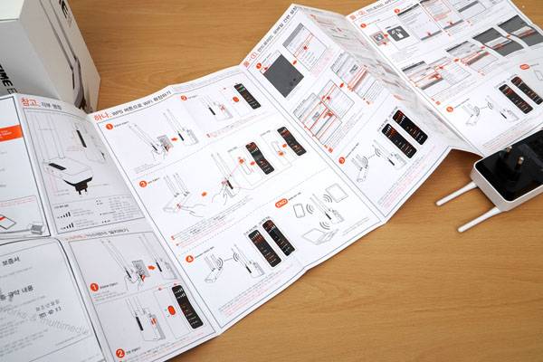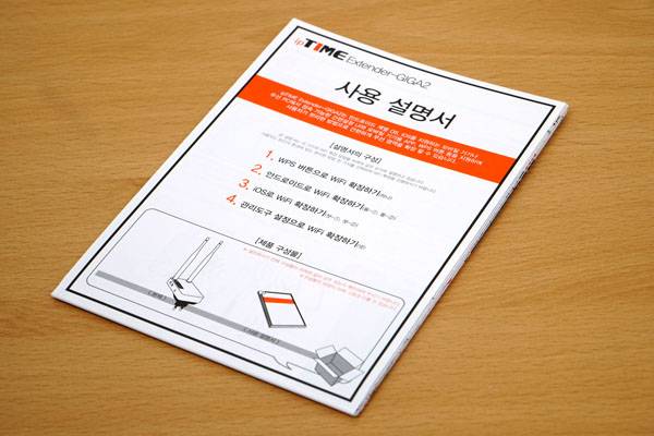 ipTIME Extender-GIGA2의 제품 구성은 본체와 한글 사용 설명서로 단순하다. 본체에 전원 플러그가 달려있어 바로 전원 콘센트나 멀티 탭에 꽂아서 쓰기 때문에 별도의 전원 연결이 필요없고 무선 네트워크 범위를 확장하는 용도로 쓰기 때문이다. 다만 기가비트 랜 포트에 연결할 수 있는 유선 랜 케이블도 제공되지 않는다.