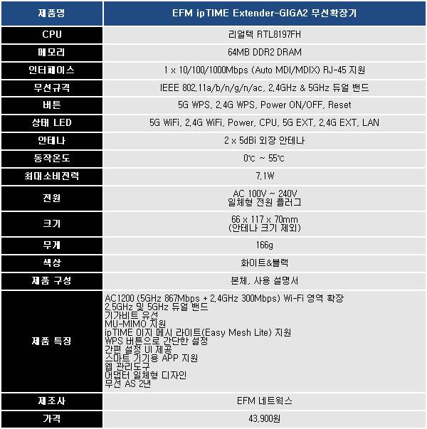 ipTIME EXtender-GIGA2는 4만원대 가격으로 손쉽게 Wi-Fi 5 무선 기능을 확장할 수 있으며 기가비트 랜 포트를 통해 무선 랜카드 기능도 제공한다. 제조사인 EFM 네트웍스로부터 무상 2년의 AS를 받을 수 있다.
