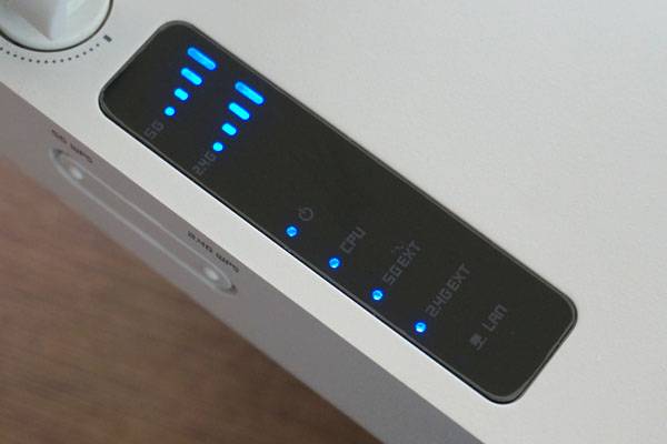 Extender-GIGA2의 전면에 달린 상태표시 LED는 5GHz와 2.4GHz Wi-Fi, 전원, CPU, 5G EXT 및 2.4G EXT, 그리고 유선 LAN 동작 상태를 파란색 LED로 보여준다. 무선확장기로 사용할 때와 메쉬(Mesh) 에이전트 사용 시의 연결 상황도 LED 표시로 구분 가능하다.