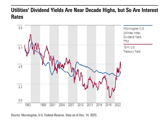 또 지난해 후반부에는 미국 연방준비제도(Fed·연준)의 금리인상 여파로 대표적 안전 자산인 미국 국채 금리가 급등했습니다. 통상 유틸리티 업종은 미국의 10년물 국채보다 높은 배당수익률을 기대할 수 있지만 국채 금리가 급등하면 배당주 매력이 상대적으로 떨어집니다.
