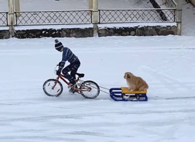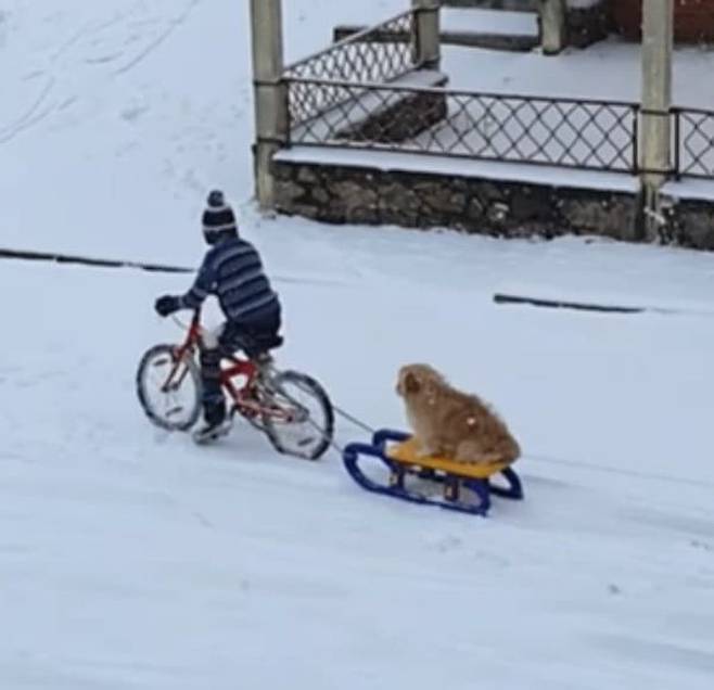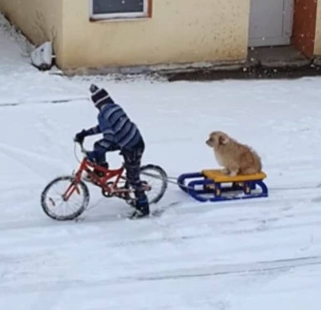 여기 사랑하는 반려견에게 썰매를 태워주고 싶어서 자전거에 연결, 직접 썰매를 끄는 아이의 모습이 공개돼 보는 이들에게 잔잔한 감동을 주고 있습니다.
