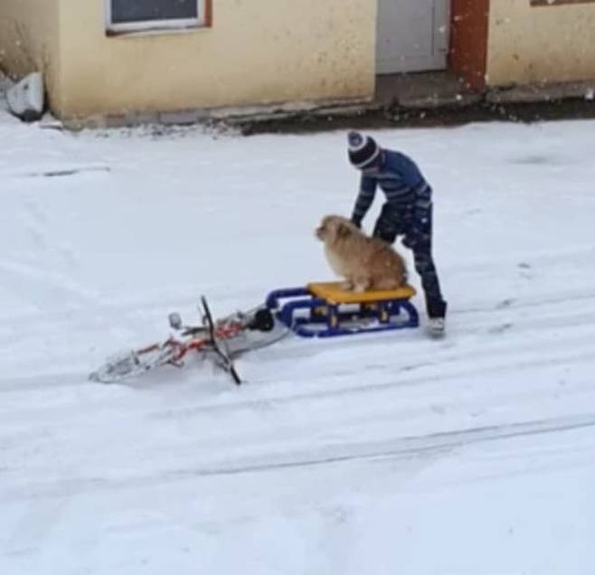 당당히 자전거까지 끌고 반려견 푸피와 함께 밖으로 나온 것. 아이는 썰매 위에 반려견 푸피를 태운 다음 자신의 자전거와 썰매를 끈으로 이어 묶은 뒤 자전거를 타기 시작했는데요.