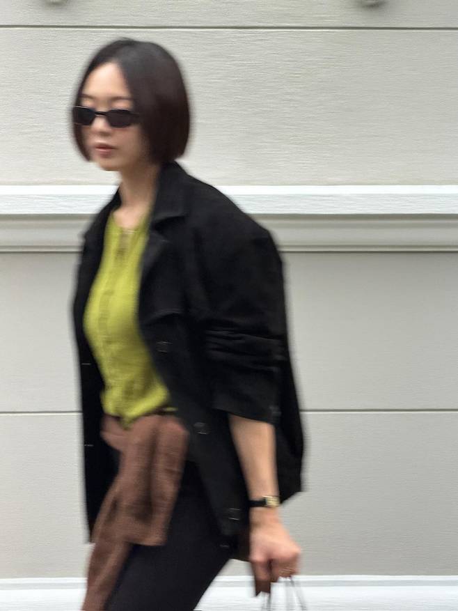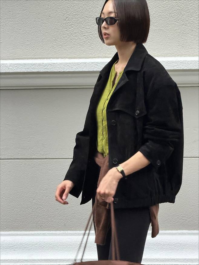 올리브빛 가디건에 블랙 자켓을 가볍게 걸쳐준 조합은, 색 자체가 분위기를 만들어내는 느낌이었죠.