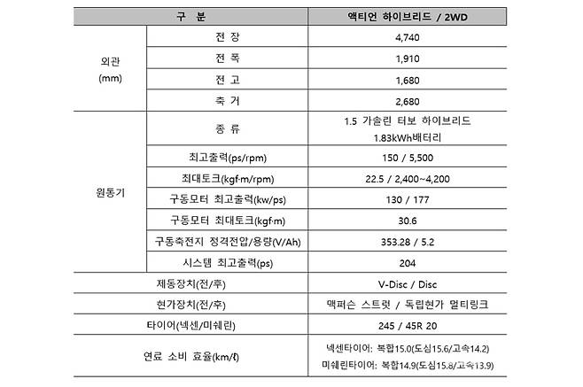 액티언 하이브리드는 먼저 출시된 액티언 가솔린의 단점을 보완해 완전히 다른 차로 느껴진다. 댐퍼를 포함한 달라진 서스펜션 셋업과 하이브리드 고유의 정숙성을 통한 고급스러운 주행질감, 개선된 UX가 특징이다. 남들과는 다른 스타일의 SUV를 원하는 소비자에게 충분히 매력적이다.