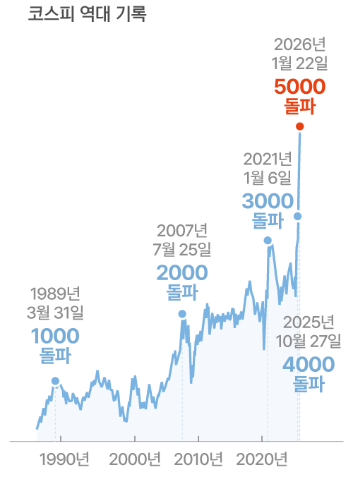 불과 1년 전인 2025년 1월 22일에 코스피는 약 2547포인트였어요. 딱 1년 만에 국내 주식 시장이 2배 가까이 커졌다는 뜻이에요. 올해 상승세만 봐도 그래요. 지난해 마지막 거래일에는 코스피가 4214였는데, 새해 들어 3주 만에 놀라운 상승세로 5000에 도달했어요. 실제로 경제가 그렇게 빨리 성장할 리 없으니, 아무래도 급하게 오른 느낌이긴 하죠.