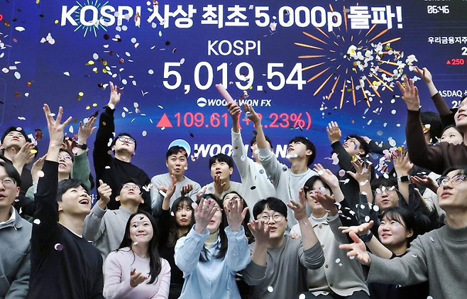 코스피는 지난해 10월 27일에 처음으로 4000을 넘긴 채 거래를 마쳤는데요. 이후 약 2달 반 만에 5000 마저 넘기며 유례없는 급등세를 보여줬어요. 모든 언론은 “새 역사”나 “대기록” 같은 표현을 넣어서 뉴스를 쏟아냈고, 금융회사들은 한국 금융시장의 성장을 보여주는 기념비적 숫자를 축하했어요.