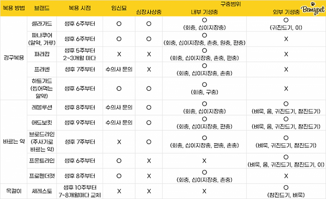 - 브로드라인 : 심장사상충, 회충, 십이지장충, 편충, 촌충, 벼룩, 참 진드기, 이 예방(내외부 구충제)