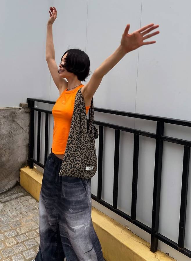 공개된 사진 속 나나는 오렌지 나시탑과 루즈한 청바지, 여기에 호피무늬 에코백을 매치한 무심한 듯 세련된 일상룩을 연출했다.