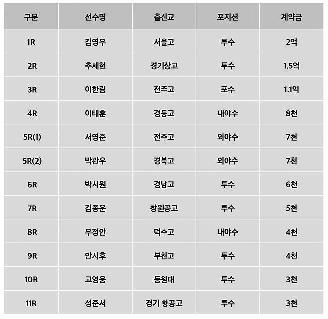 1라운드 지명을 받은 투수 김영우(서울고)는 계약금 2억원에 계약을 체결했다. 김영우는 투구 밸런스가 안정적이고 간결한 팔 스윙으로 빠른 공과 낙폭이 큰 커브가 강점으로 평가 받는다. 올해 성적은 12경기 2승1패 27이닝을 던져 평균자책점 3.33을 기록했다.