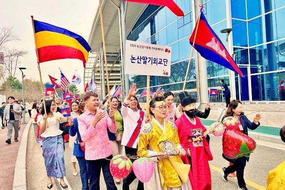 | ▲ 논산딸기축제 퍼레이드에 참여한 외국인들. 시민들과 함께 논산딸기축제를 알렸다. |