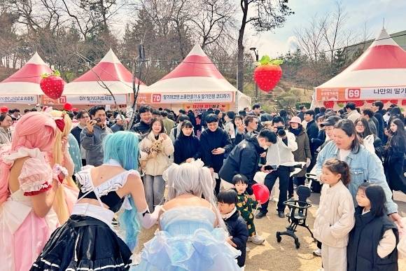 | ▲ 지난 27일부터 30일까지 4일 동안 논산시민가족공원에서 열린 2025 논산딸기축제는 연일 문전성시를 이뤘다. 화려한 복장을 한 코스프레 참가자들이 관광객들과 기념사진을 찍고 있다 |