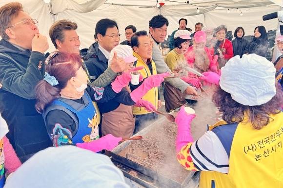 | ▲ 딸기축제기간동안 백성현 논산시장은 축제장 곳곳을 누볐다. 29일 백성현 논산시장이 한우무료시식회장을 찾아 조용훈 논산시의회 의장, 김종욱 의원, 이태모 의원과 함께 관광객들에게 시식용 한우불고기를 나눠어 줬다. |