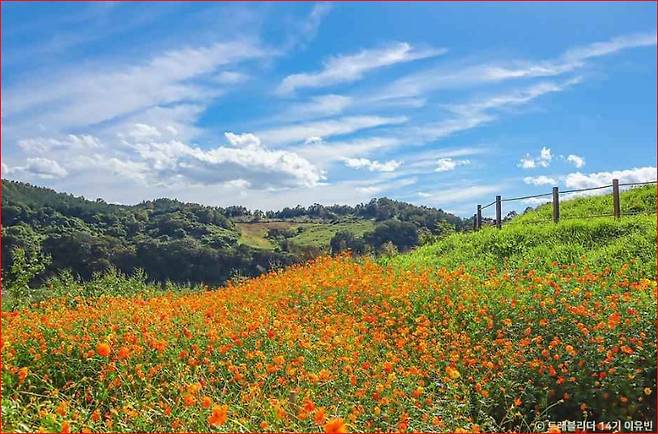 연천 삼곶리 돌무지무덤 앞, 약 3만㎡ 규모의 넓은 벌판 위에 댑싸리 2만여 그루가 심어져 있습니다. 한 폭의 유화처럼 펼쳐진 이 풍경은 그 자체로 감탄을 자아내지요. 댑싸리만 있는 것이 아닙니다. 황화 코스모스, 국화, 백일홍, 천일홍, 마리골드, 일일초, 칸나까지… 다채로운 계절 꽃들이 함께 어우러져 걷는 이들의 발걸음을 더욱 즐겁게 합니다.