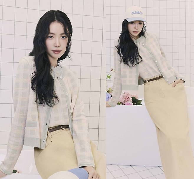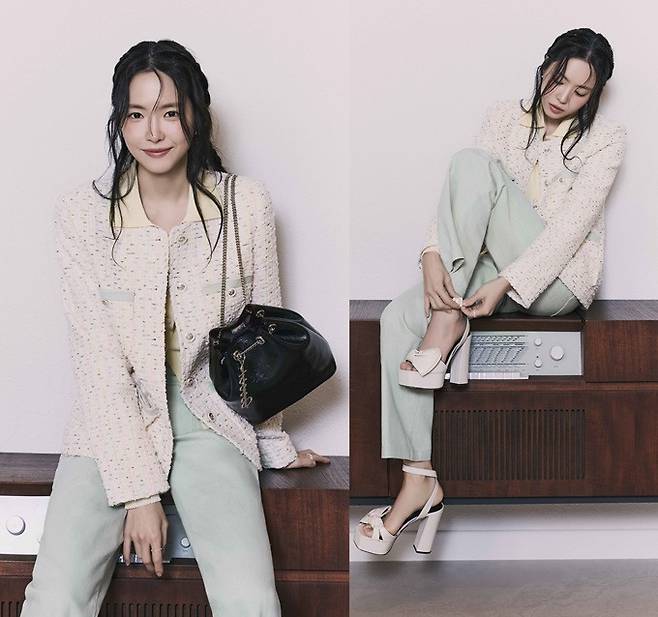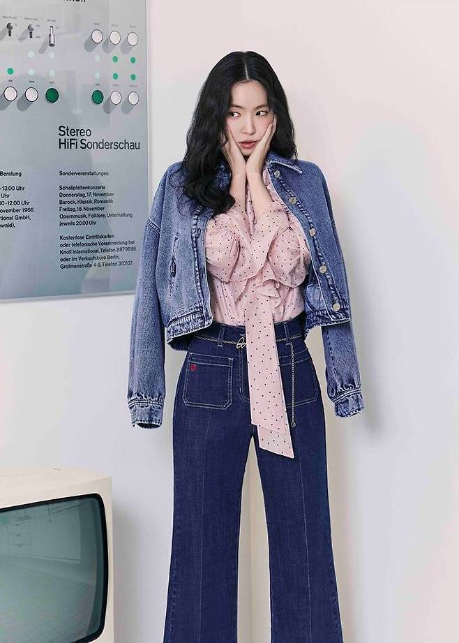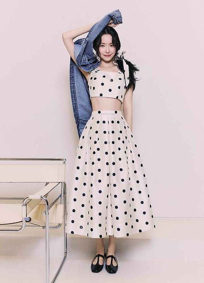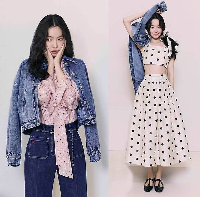손나은은 도트 무늬 원피스와 매치한 복고풍의 레이디라이크룩, 또 와이드 핏 데님 팬츠와 매치해 세련미 넘치는 청청패션을 연출했다.