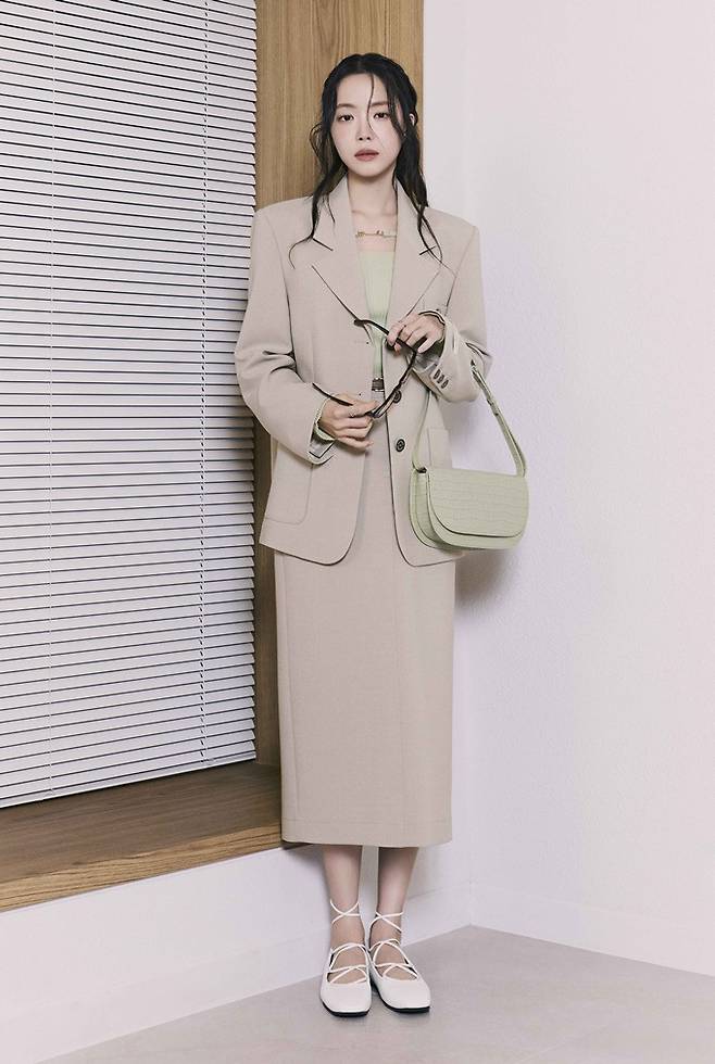손나은이 착용한 싱글 재킷은 로고 장식이 돋보이는 루즈핏 실루엣으로 같은 소재의 H라인 롱스커트와 매치하면 품격있는 오피스룩을 연출한다.