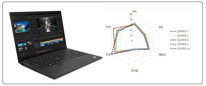 반면 T 시리즈는 씽크패드 시리즈 중 가장 대표적인 주력 모델이다. 그만큼 종류도 많고 파생 상품도 다양하다. 본격적인 비즈니스 노트북인 만큼 대다수가 인텔 13세대 코어 i7 CPU를 탑재했고, 인텔 내장 그래픽이나 Arc 그래픽 칩셋을 사용한다. 더불어 시리즈 전반에 걸쳐 1920x1200(WUXGA) 해상도에 400니트 밝기를 지원하는 디스플레이를 제공하며 무게는 1kg 대 초반이라 휴대성도 매우 뛰어나다. 주사율은 차치하고도 상대적으로 낮은 해상도가 밸런스 전체를 하락시키고는 있지만, 어느 정도 가성비로 타협이 가능해 업무용 노트북으로 각광받는 제품군이라 하겠다.