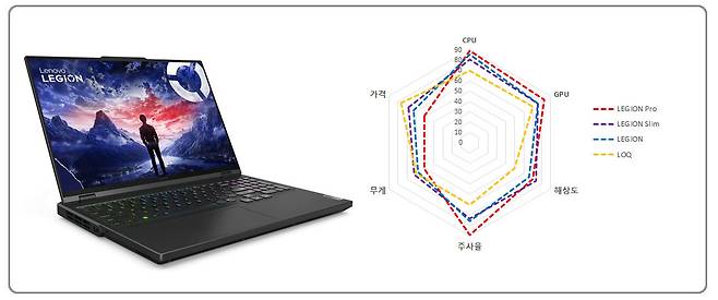 LEGION과 LOQ의 대략적인 성능을 요약한 그래프에서도 볼 수 있듯이, 무게 방면을 제외한 다섯 가지 요소에서 뛰어난 모습을 보인다. 또한, LEGION 내부에서도 일반 LEGION, LEGION Pro, LEGION Slim으로 시리즈가 나뉘며, 스펙다운을 한 LOQ까지 합해 레노버의 게이밍 노트북 라인업을 완성한다.