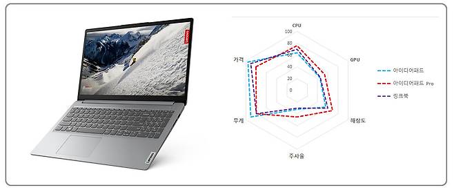 아이디어패드 Pro는 아이디어패드 Slim5의 스펙을 더 올린 제품군이다. 육각형 그래프를 보면 밸런스가 상당히 잘 맞는 것을 확인할 수 있다. CPU는 비슷한 AMD 8845HS를 탑재한 모델이 많으나 인텔 메테오 레이크 코어 울트라9 185H를 장착한 고급형 모델도 존재한다. 공통적으로 인텔 Arc부터 엔비디아 RTX 3050, RTX 4050 그래픽 칩셋을 옵션으로 선택할 수 있다. 해상도도 일반 아이디어패드보다 살짝 높은 2880x1800(WQXGA+)까지 올라가며 그 이하 해상도도 존재한다. 주사율은 120Hz로 일반 아이디어패드보다 살짝 높다. 덕분에 가격대는 100만 원대 초중반에서 200만 원을 훌쩍 넘는 모델도 존재한다.