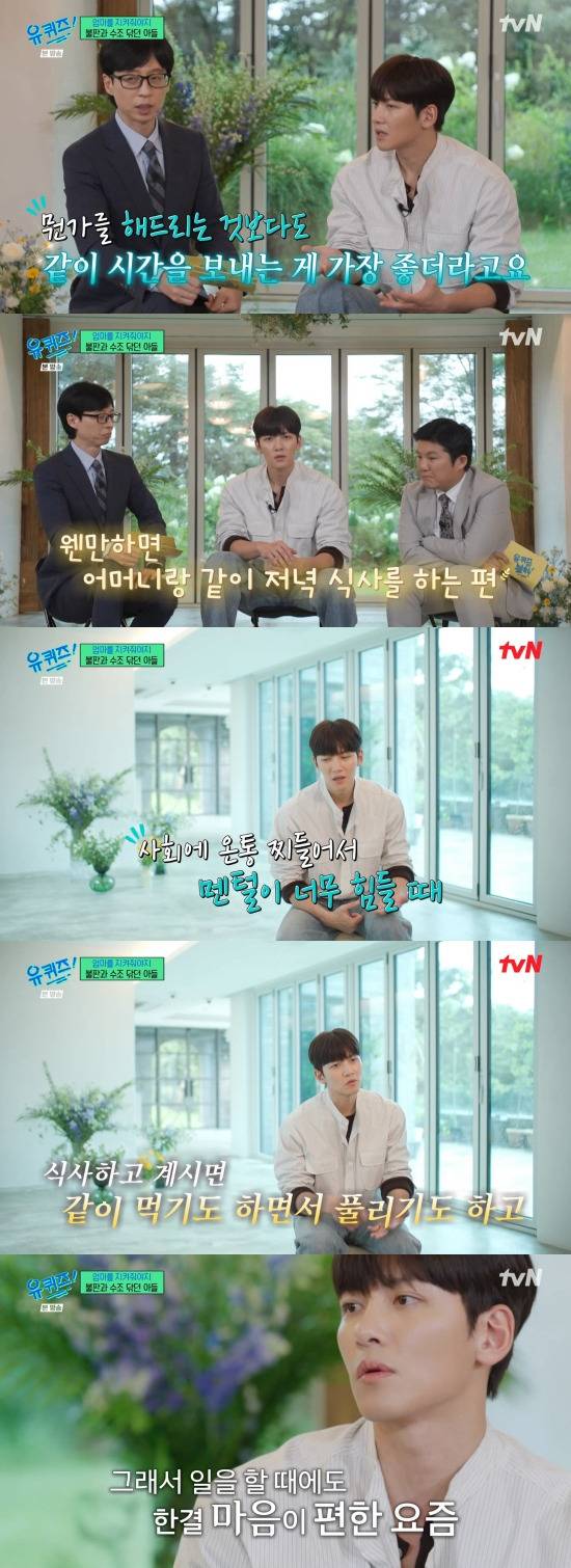 유재석은 "같이 있는 것만으로도 든든하시지 않을까"라며 칭찬했고, 지창욱은 "일을 하다 보면 스트레스도 받기도 하고 멘탈이 안 좋을 때도 있고 그런데 어머니가 일상생활을 하시는 모습을 보면 힐링이 되는 거 같다. 사회에 온통 찌들어서 멘탈이 힘들 때 집에 문 열고 들어갔는데 어머니가 거실에서 TV 보고 계시는 모습들 아니면 주무시고 계시는 모습, 빨래하고 계시는 모습 이런 일상들이 저한테 힐링이 된다. 들어갔는데 어머니 식사하고 계시면 같이 먹기도 하면서 이야기하면서 풀리기도 하고. 그런 게 없이 집에 들어갔는데 혼자 불 꺼진 방에 덩그러니 앉아서 시간을 보내고 이랬으면 '조금 더 헤매지 않았을까' 이런 생각이 든다"라며 털어놨다.